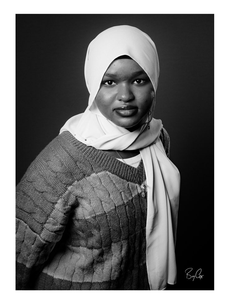 First, for artistic reasons and knowing the images would be publicly displayed as a set, I opted for black and white. This would create visual cohesion regardless of the colors people wore. Second, with a high-contrast look created by dark shadows, I could draw the viewers eye to the face while accentuating textures of the face and clothes. Together, this would create stunning character portraits.